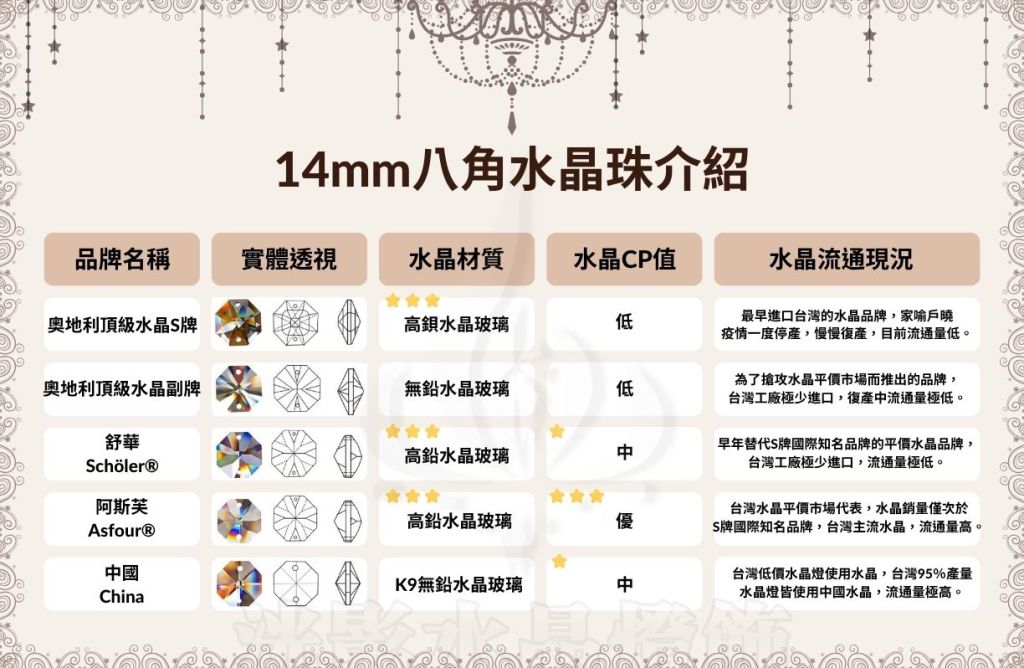 市面上的水晶品牌眾多,魚目混珠的案例也層出不窮,如何簡單快速的了解水晶品牌並清楚的告訴大眾,是洸影水晶燈一直思考的重點,因此我們拍攝短片、撰寫文章、分享圖片,現在我們整理了全部的資料再度推出全台灣最完整、最詳細的進口水晶品牌的完整比較&介紹,簡單的分類、評比、星星讓大家一目瞭然,更快讓大家了解各種品牌水晶品質與特性!這樣廢話不多說,就讓我們立刻來看看吧!!